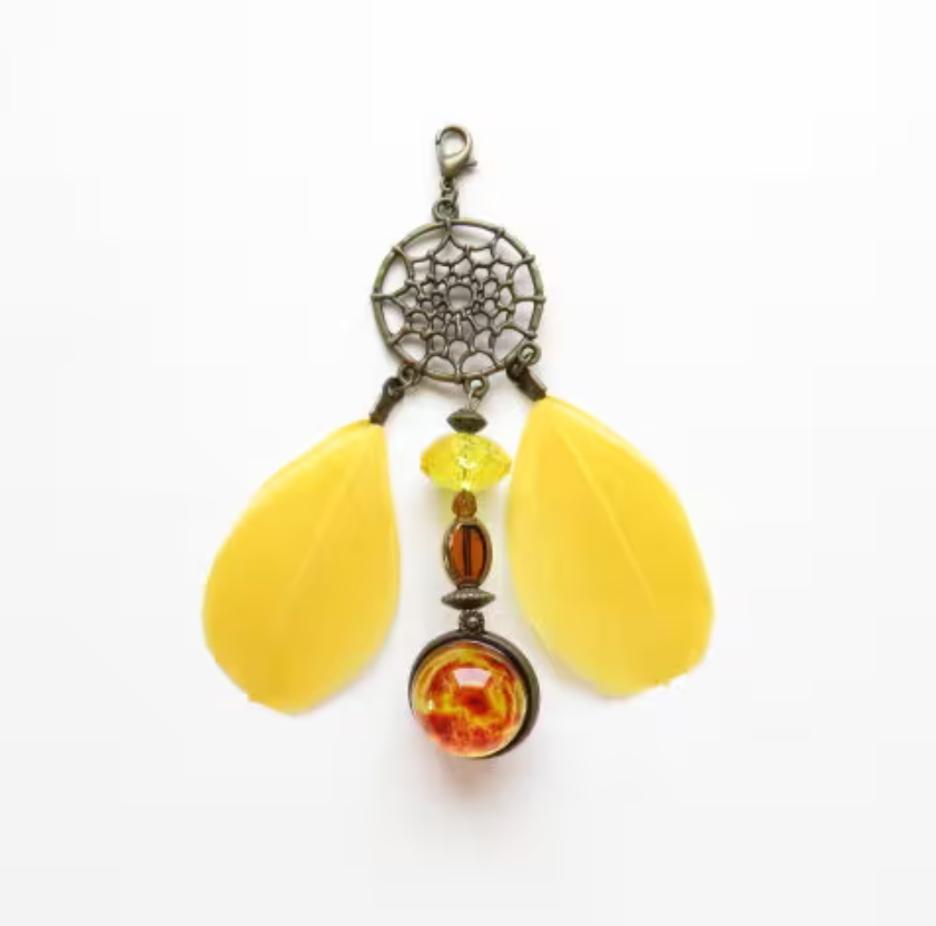 avec perles jaunes et bronze et 2 plumes jaunes,
