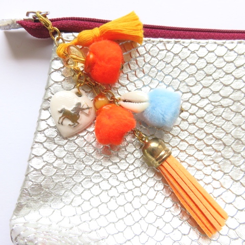 Composé d’une chaine dorée avec un pompon* cloche orange, pompons* oranges et bleus, perles orangées, 1 cœur céramique du signe du sagittaire, 1 coquillage cauri